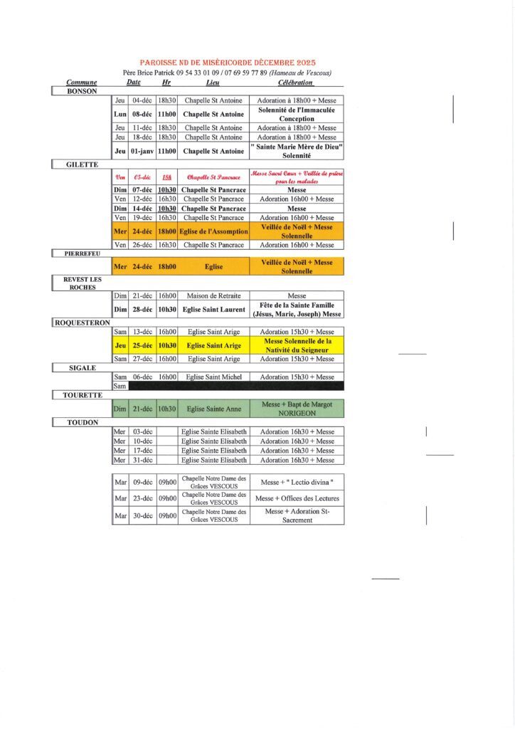 Retrouvez ici le planning de décembre 2025 de la paroisse Notre Dame de Miséricorde.